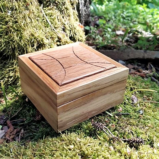 Laivan- ja veneenrakentajilta sain tammipuuta, joka heille oli jäänyt yli mm Suomen Joutsenen korjaustöistä. Tammi on niin kaunis puulaji, että halusin tehdä sille oikeutta ja käyttää kannessa pelkästään sitä. Koristelun jätin tarkoituksella minimalistiseksi, ohuet kaiverrukset eivät vie liikaa huomioita upeasta puusta.