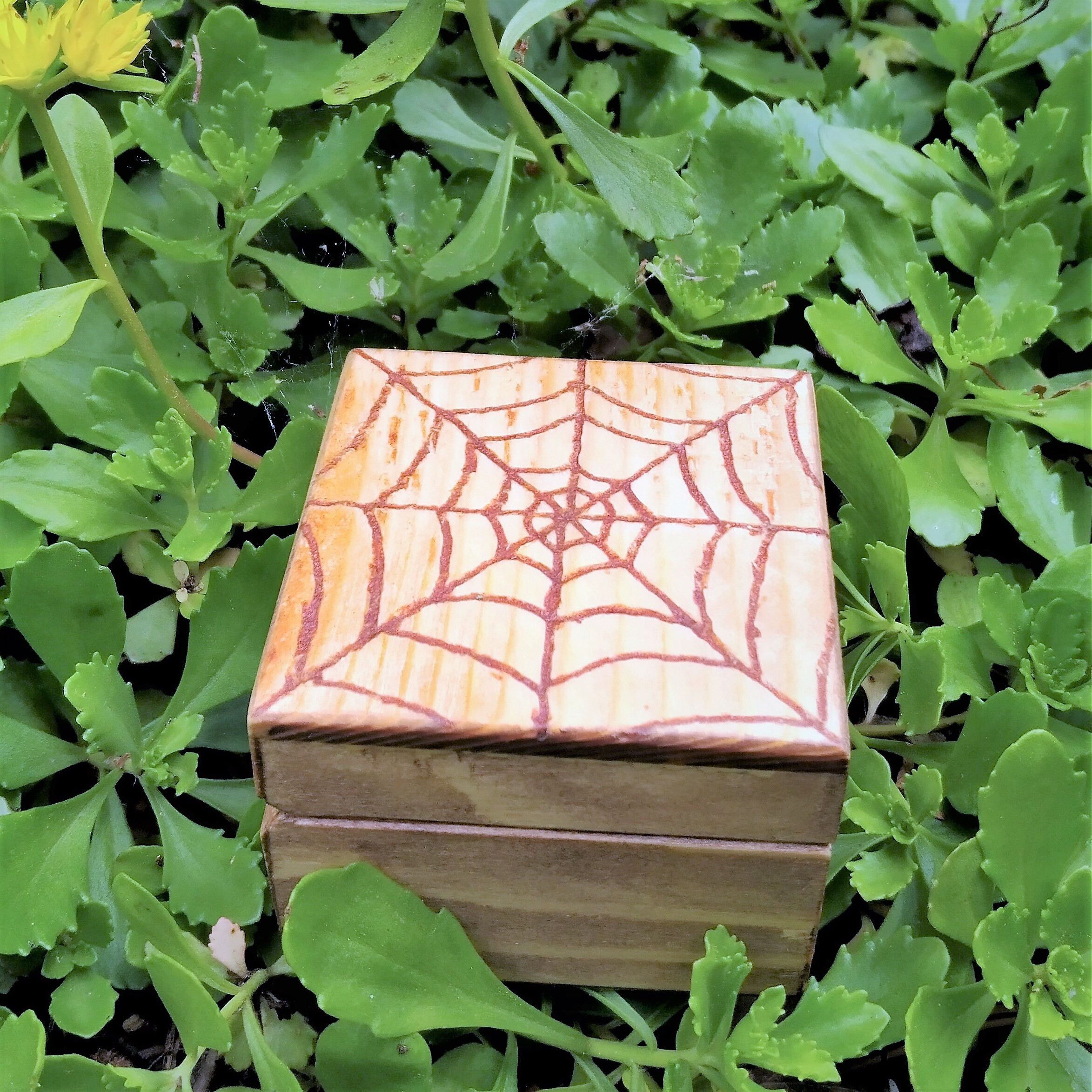 Hämähäkin seitti korurasian kanteen on tehty kaivertamalla. Mahonkijauhe antaa kaiverrukselle värin.