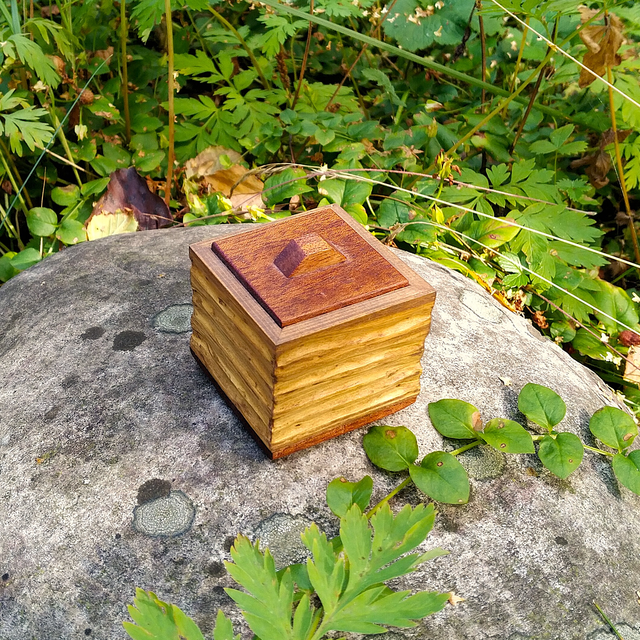 Tässä korurasiassa olen jatkanut puun pintojen kaiverrusta. Halusin kokeilla kaiverrusta ja aloin improvisoida. Tuloksena rasian sivuissa on kuin rouhevan syystuuleen vaakasuoraan taivuttamat kaislat.