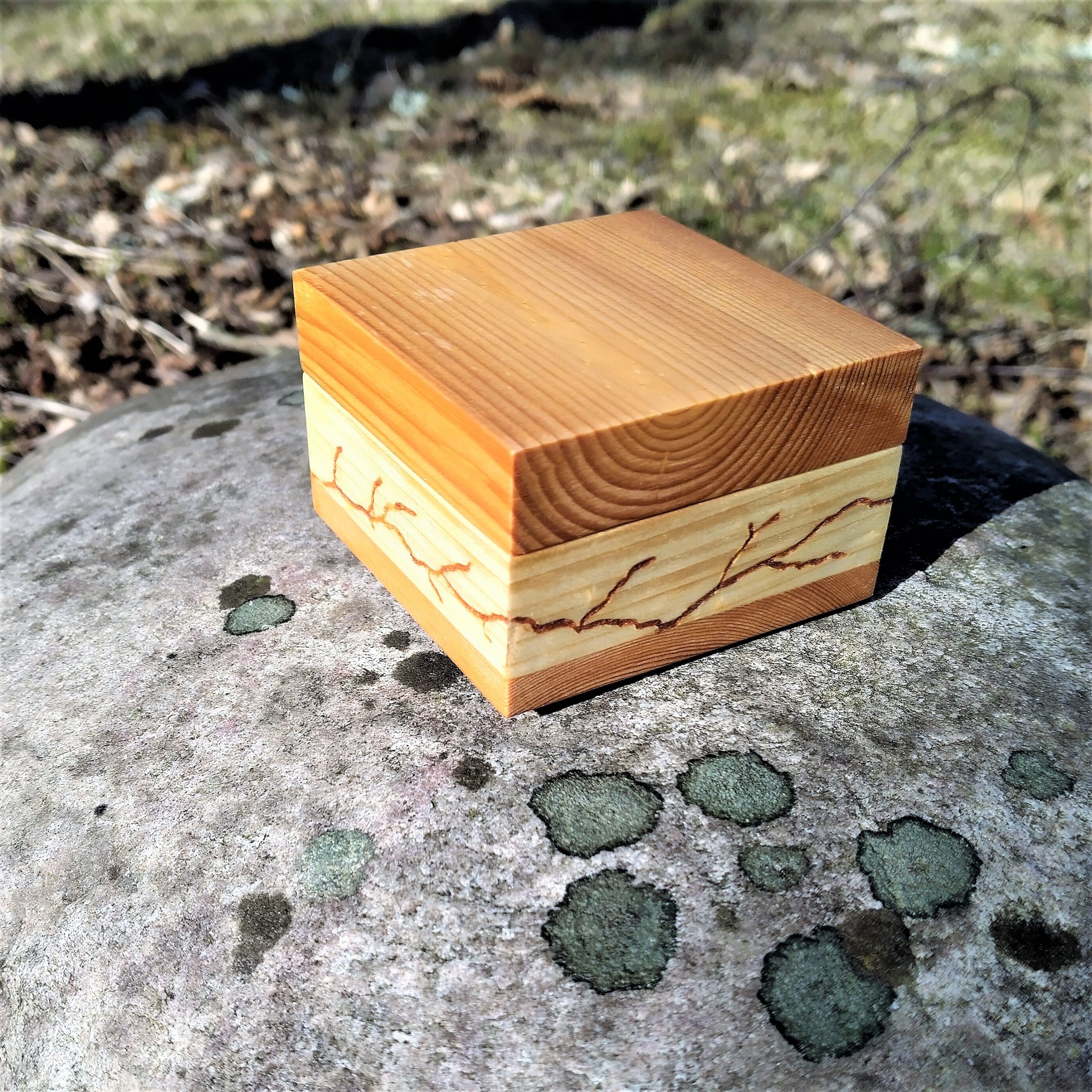 Rasian sivuihin on kaiverrettu kelohongan innoittamana kuivuneen oksan muotoa. Kaiverretut urat on sitten täytetty mahonkijauholla. Pidän osin rosoisesta lopputuloksesta – kräkä mikä kräkä.