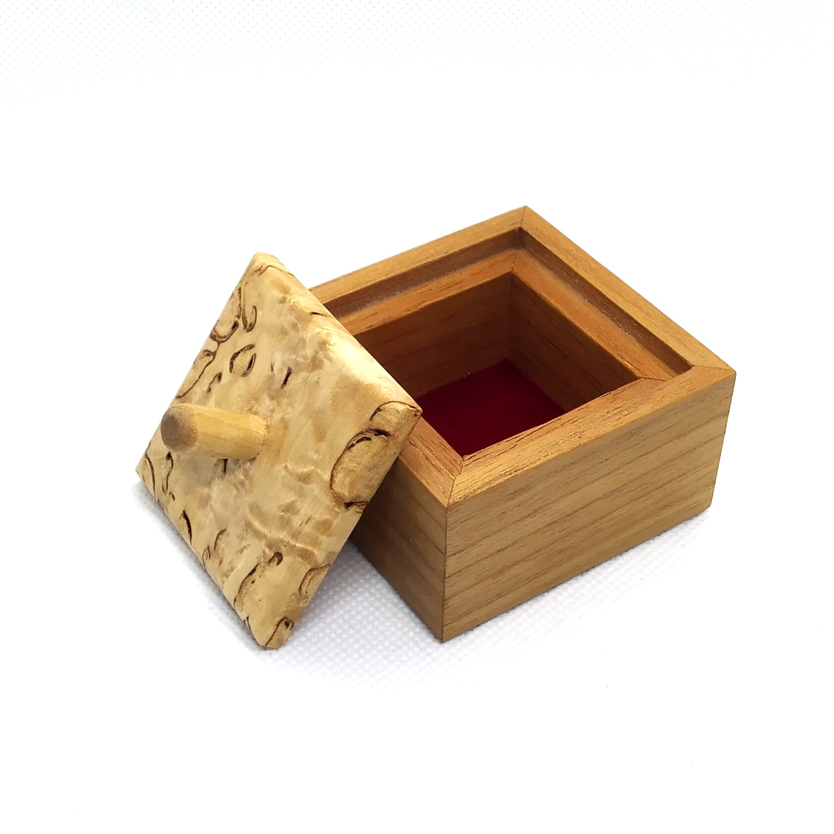 Ainutlaatuinen puinen käsintehty korurasia on hieno lahja – itselle tai muille. Rakastan visakoivua tumman puun kanssa. Tällä kertaa pariksi valikoitu iroko, jota laivanrakennuksessa on käytetty joskus tiikin vaihtoehtona. Kannen otin on pitkä, jotta sormille on tilaa. Siitä tulee väkisin mieleen pieni puinen poika, joten rasian nimi syntyi itsestään.