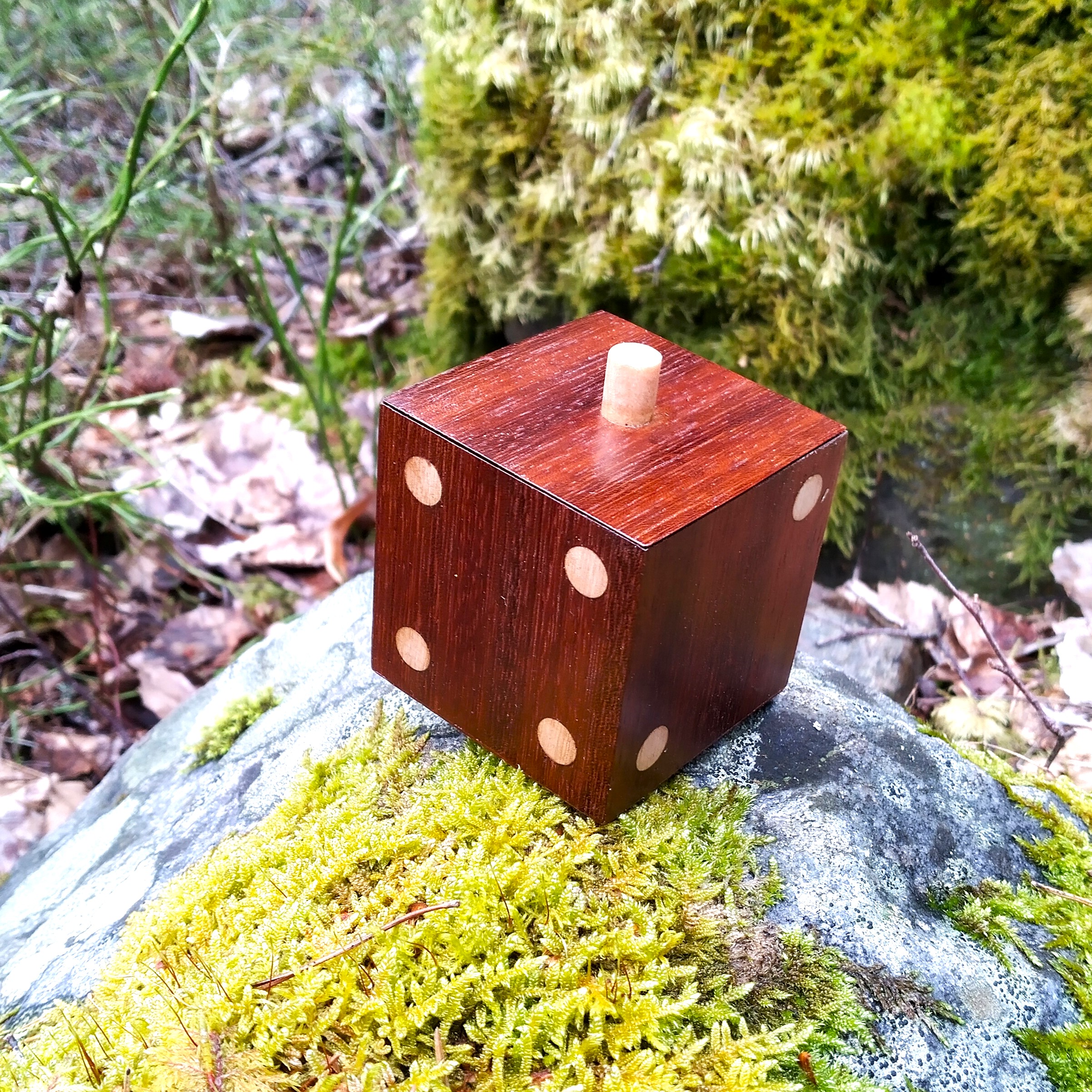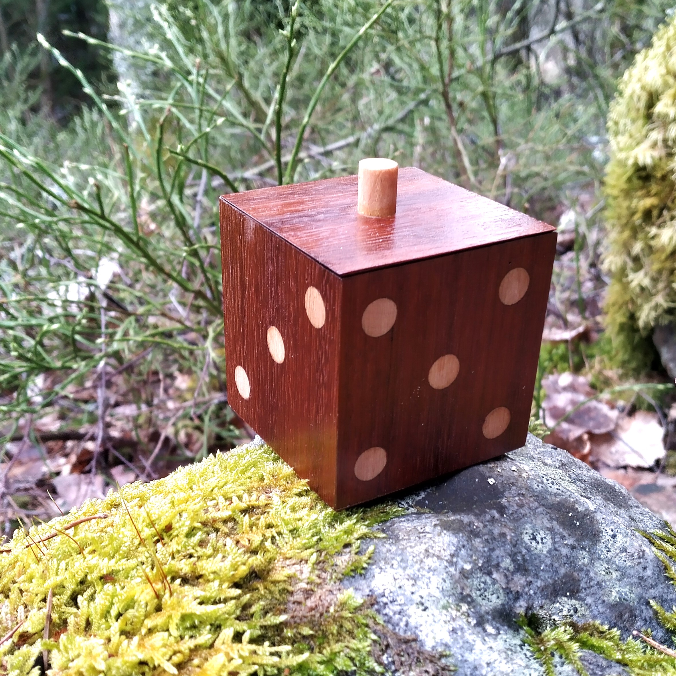 Olin pitkään pyöritellyt mielessäni ideaa noppakuutiosta, joka olisikin korurasia. Itseasiassa teinkin jo yhden, mutta se ei teknisesti vastannut vaatimuksiani, joten se jäi hyllylle odottamaan. Ärsyttämään luovia nystyröitä. Lopulta päätin yrittää uudelleen. Käytin painavaa puuta, jonka olen saanut lahjaksi ja täytyy tunnustaa, etten ole aivan varma sen laadusta. Luulen, että se on irokoa. Lopputulokseen olen erittäin tyytyväinen – se on juuri sellainen kuin halusin.